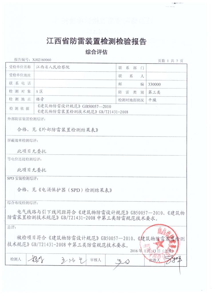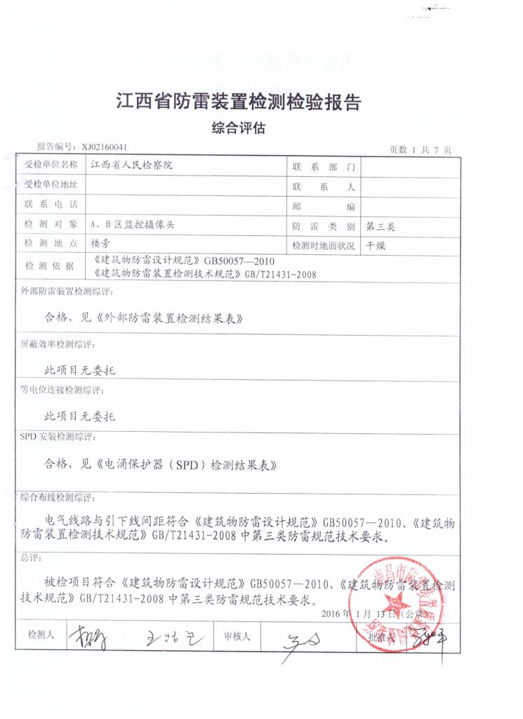 江西省人民檢察院辦案工作區(qū)防雷工程現(xiàn)已全面竣工,工程各項技術(shù)指標均符合有關(guān)規(guī)范要求!